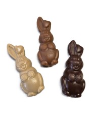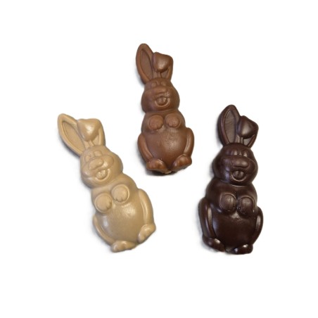 Paashaas snack van 10cm a 30gram, in de kleuren van witte, melk en pure chocolade.- glutenvrije recetpuur- geen toegevoegde suikers